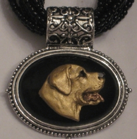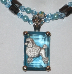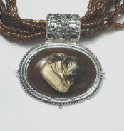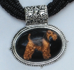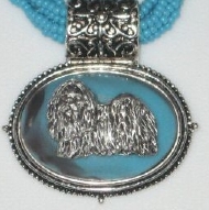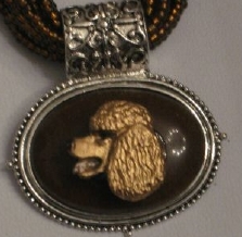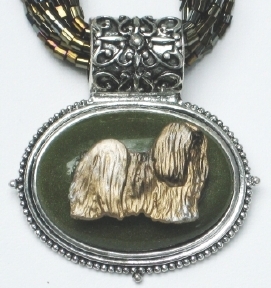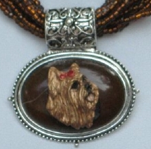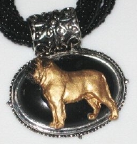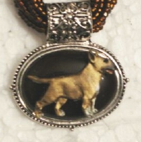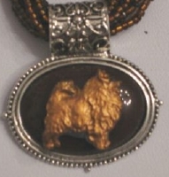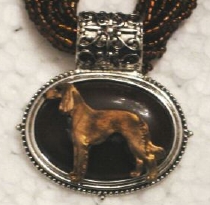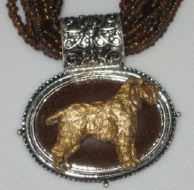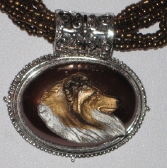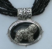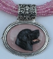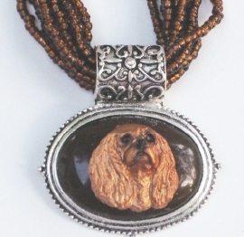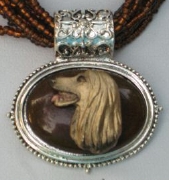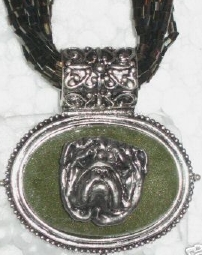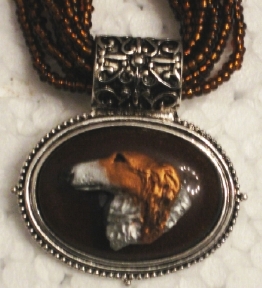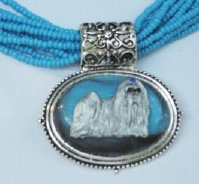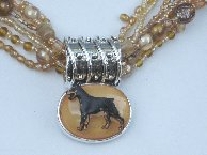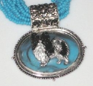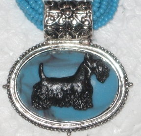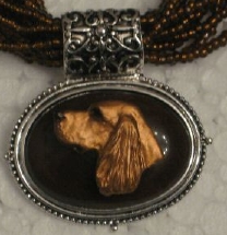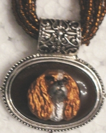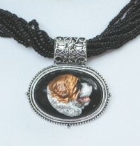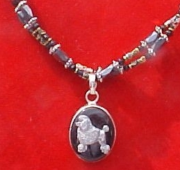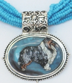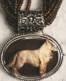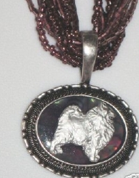 Multi strands of shimmering beads, with pretty faux stone matching pendant in silvertone setting. On face of stone is mounted a headpiece or full body of dog, either handpainted or pewter. Necklace measures 16" - 19" and has a 3 inch extender chain, making it adjustable. Beatiful example of the breeds. Most AKC breeds avaialbe. Beautiful detailed breed type. Will turn heads! Beaded necklaces available in Black, Brown, Green, Purple, Grey, and Turquoise. Matching oval style earrings are included...makes a gorgeous set. Examples below.  Allow 4-6 weeks as artists make each piece individually.